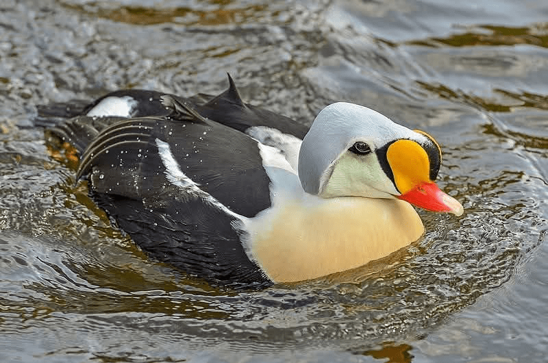 the pearl of water on the eider’s glossy back.
