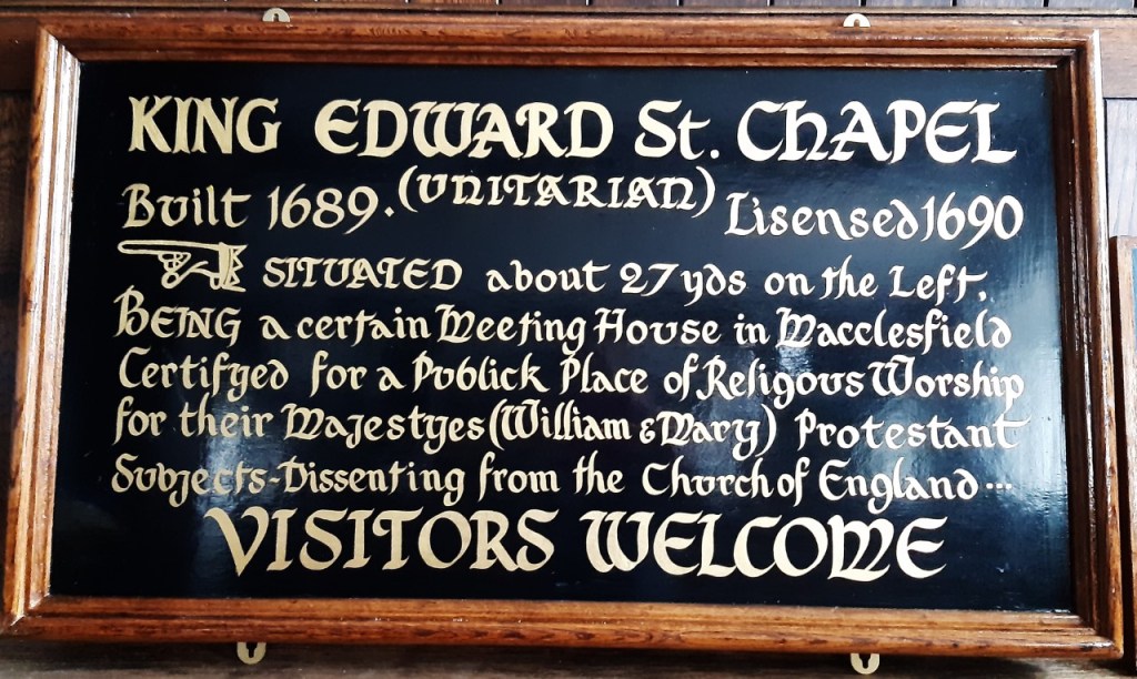 With the passing of the Act of Toleration in 1689 these groups could come in from the cold and build places of meeting in the towns, and the King Edward Street Chapel was built that very year. To this day we are reminded of that background story because it was built as a barn – a Cheshire Barn – and to this day it is still technically required by law that the Chapel doors must stand open during services so that the Magistrate may be able to hear if sedition and heresy are being preached!